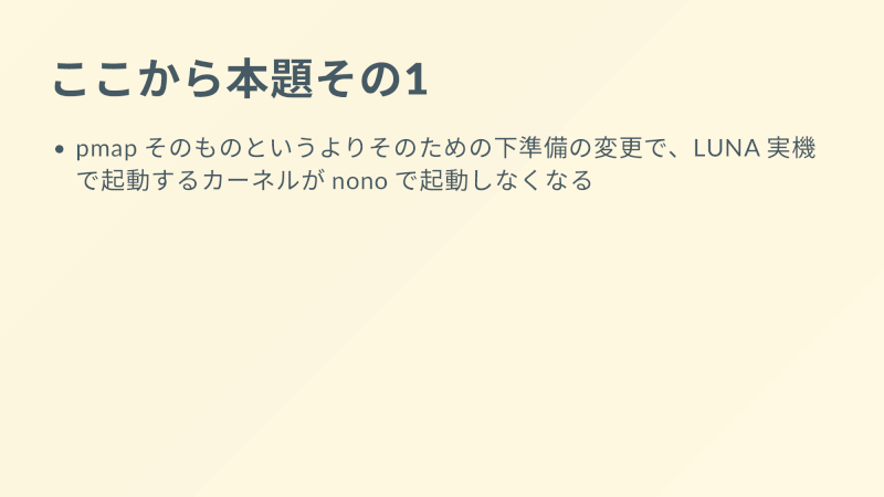 - pmap そのものというよりそのための下準備の変更で、LUNA 実機で起動するカーネルが nono で起動しなくなる