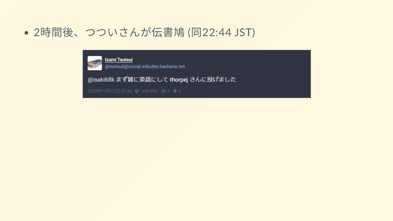 - 2時間後、つついさんが伝書鳩 (同22:44 JST)