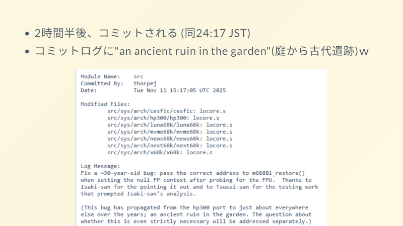 - コミットログに"an ancient ruin in the garden"(庭から古代遺跡)w